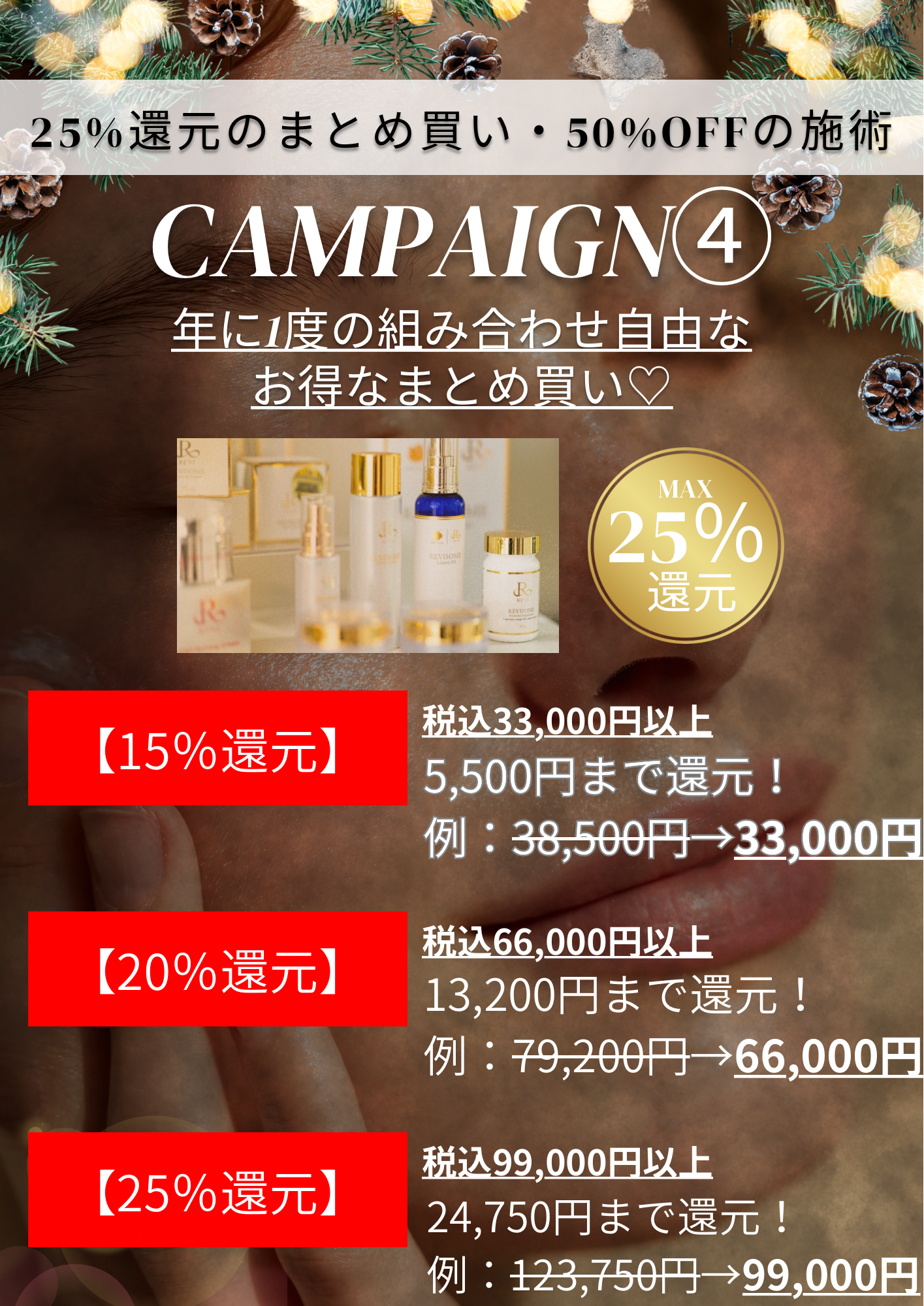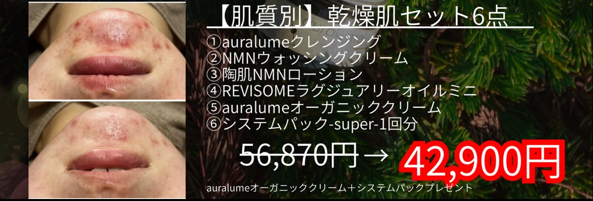 auralume by REVI オーガニックシリーズ 肌質改善セット 商品名・内容量 オーガニックローション(100ml) オーガニックセラム(30ml) オーガニッククリーム(30g) ★REVIウォッシングクリーム(100g) ★REVISOMEラグジュアリーマスク(1枚) 7,315円分プレゼント 【ライン使い特徴】 ✅ 相乗効果で肌のバリア機能を強化 ➡︎ ローションで潤いを与え、セラムで肌のコンディションを整え、クリームでしっかり保湿&保護。 ✅ 外的ストレス(乾燥・紫外線・大気汚染)から肌を守る ➡︎ 天然由来成分が、肌を優しくケアしながら健康的な状態をキープ。 ✅ 肌本来の力を引き出し、潤い・ハリ・透明感UP ➡︎ 美肌菌のバランスを整え、健やかでゆらぎにくい肌へ。 【以下の肌質の方に】 ✔ 敏感肌・乾燥肌の方 ➡︎ 刺激が少ないオーガニック成分で、肌を優しく整えながらしっかり保湿。 ✔ ゆらぎやすい肌(季節の変わり目やストレスで肌が不安定になりやすい方) ➡︎ 美肌菌をサポートする成分が配合されているため、肌の調子を安定させる。 ✔ エイジングケアを始めたい方 ➡︎ 抗酸化作用のある成分が豊富に含まれ、ハリや弾力をキープ。 ✔ ナチュラルなスキンケアを求める方 ➡︎ ECOCERT認証のオーガニック成分を使用し、肌にも環境にも優しい。